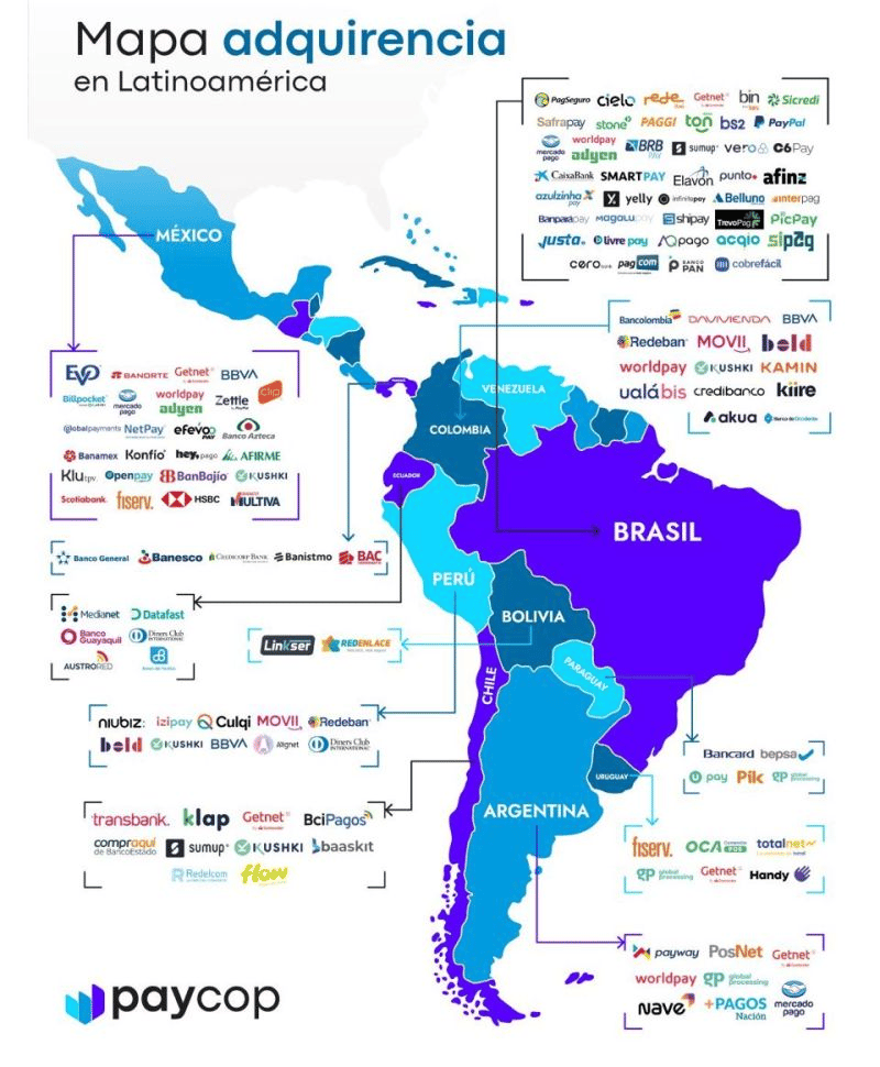 Latin America’s acquiring landscape is shifting fast. Digital-payment volumes are expected to reach about US$300 billion by 2027, and real-time transactions could exceed 100 billion, pointing to a region that is rapidly becoming more digital, fragmented and competitive. The map shows how crowded and diverse each country’s acquiring market has become, with local, regional and global players reshaping the payments ecosystem. (Source).